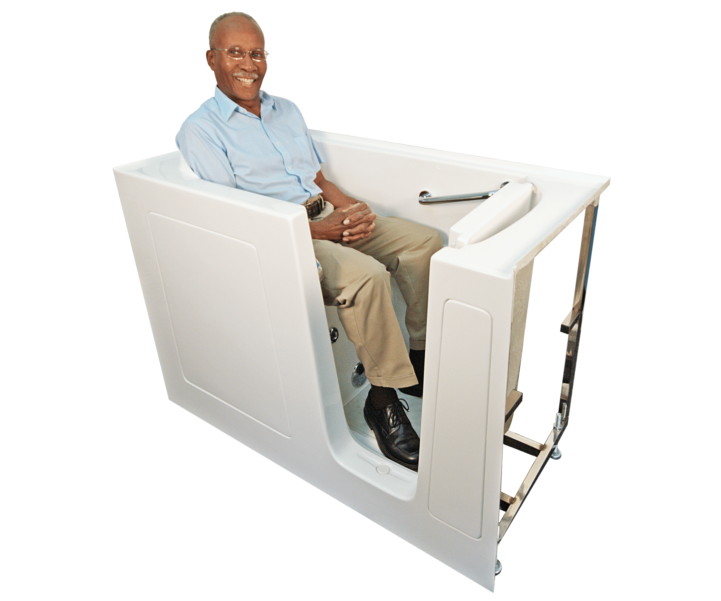 Our walk-in tub Model B2651 has a compact, yet comfortable 26-inch width and fits in installations where space is very limited. This model comes with a nine-inch wide extension kit that can fill in a 60-inch space or be cut to tailor the fit to less than 60 inches. This model may also reduce your installation costs by fitting through almost any door or hallway, eliminating the need for removal or replacement of bathroom or hall doorways.